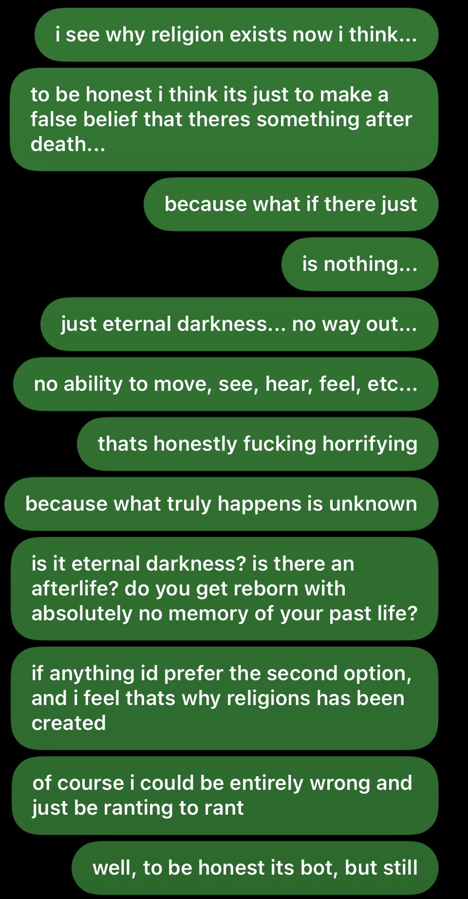 Reply OwO I'm not scared of death itself. I fear what happens after. Because what if its just eternal darkness? Just a black screen for eternity. No way out, no feeling, no nothing. Just... darkness... forever...