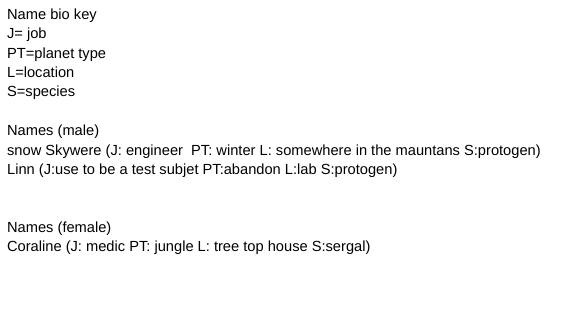 for those who can't read it that well. Name bio key, J= job, PT= planet type, L= location, S= species